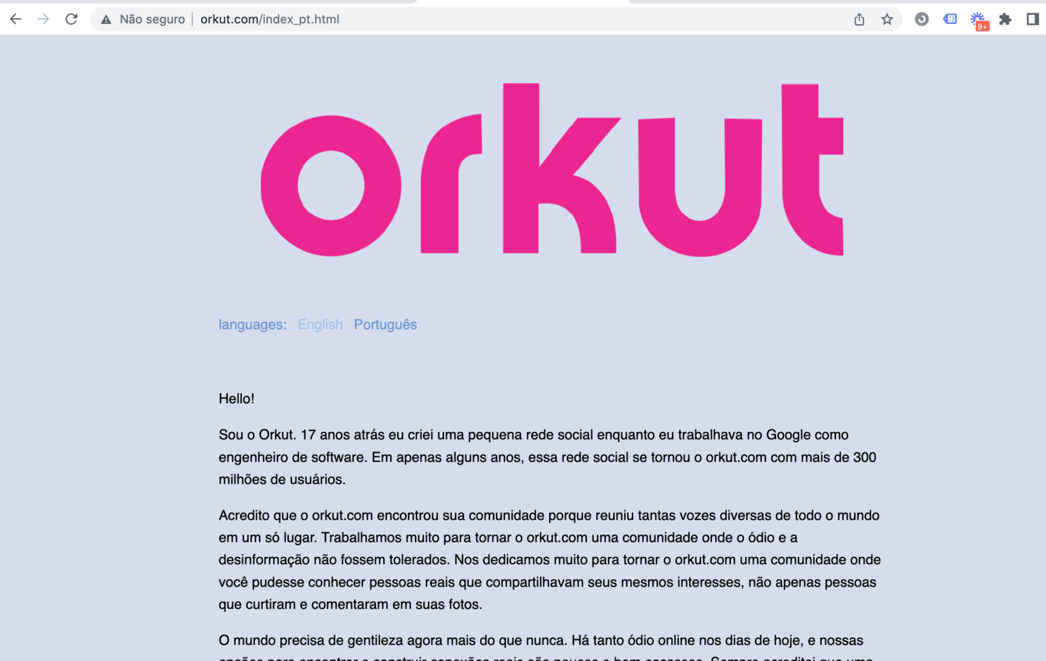 Já no final da semana, o criador do saudoso Orkut reativou a rede social e deixou uma mensagem enigmática, que levou muitas pessoas (incluindo eu) a ficarem entusiasmadas com a possível volta da rede social.