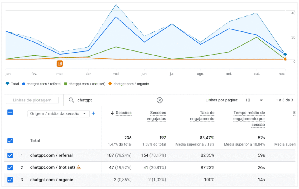 Hoje, já colhemos os frutos desse trabalho: crescimento consistente no volume de visitas, aumento de conversões e um dado que chama ainda mais atenção: leads chegando com origem identificada diretamente no ChatGPT, no Perplexity e em outras IA’s. É a prova de que a jornada de busca está mudando rapidamente e de que as empresas que se posicionarem agora terão uma vantagem competitiva relevante.