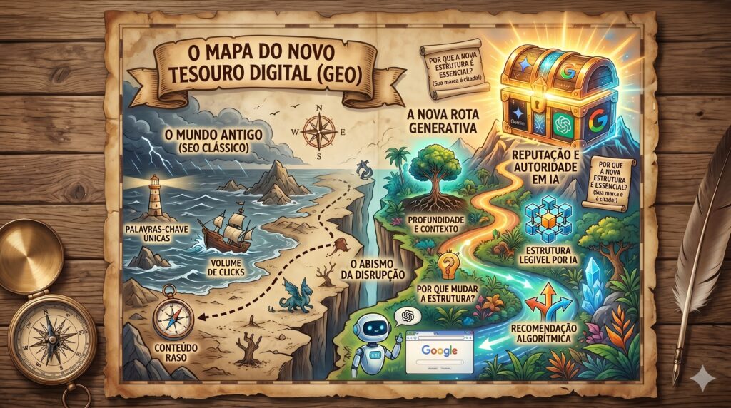 Essa mudança exige que a gente produza conteúdo de um jeito muito mais estratégico. Aqui na Explorer, temos nos especializado cada vez mais nessa frente para garantir que nossos clientes apareçam em destaque nesses resumos generativos. É o que chamamos de GEO (Generative Engine Optimization). Não basta mais apenas “estar na internet”; é preciso gerar sinais de autoridade tão fortes que os algoritmos não tenham dúvida de que você é a melhor recomendação para o usuário.
